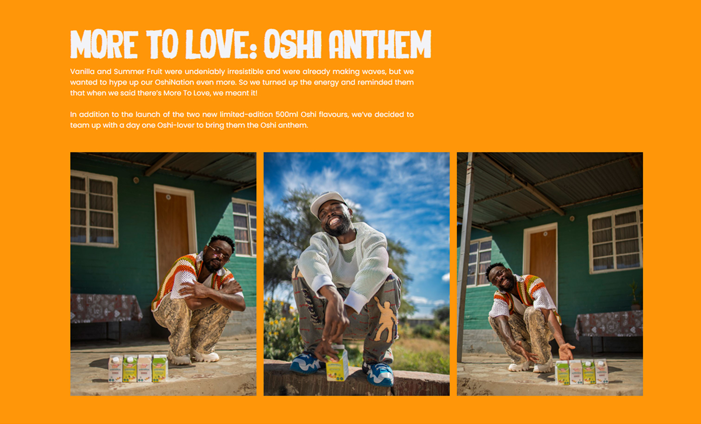 The Vanilla & Summer Fruit line extension brought fresh dimension to the range. Vanilla arrived as the slow sip - indulgent, calm, made for relaxation and personal reward, anchoring the brand's #MyOshiTime platform. Summer Fruit, however, is the complete opposite - vibrant, spontaneous, vibey and fun-loving. Together, the two flavours captured the full emotional variety of Namibian life, from Sunday chillness to weekend grooves. Photography was vivid and candid, naturally placing Oshikandela into real moments rather than staged perfection. Oshikandela is the perfect buddy for every moment.